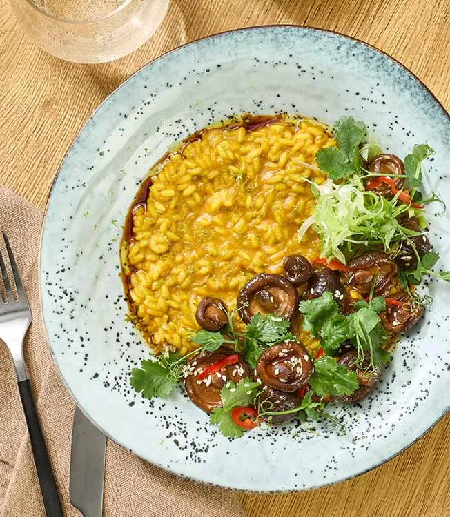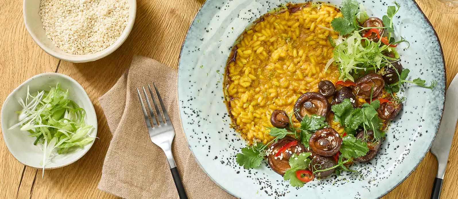 „Golden Milk“-Risotto mit Shiitake und Peperoni