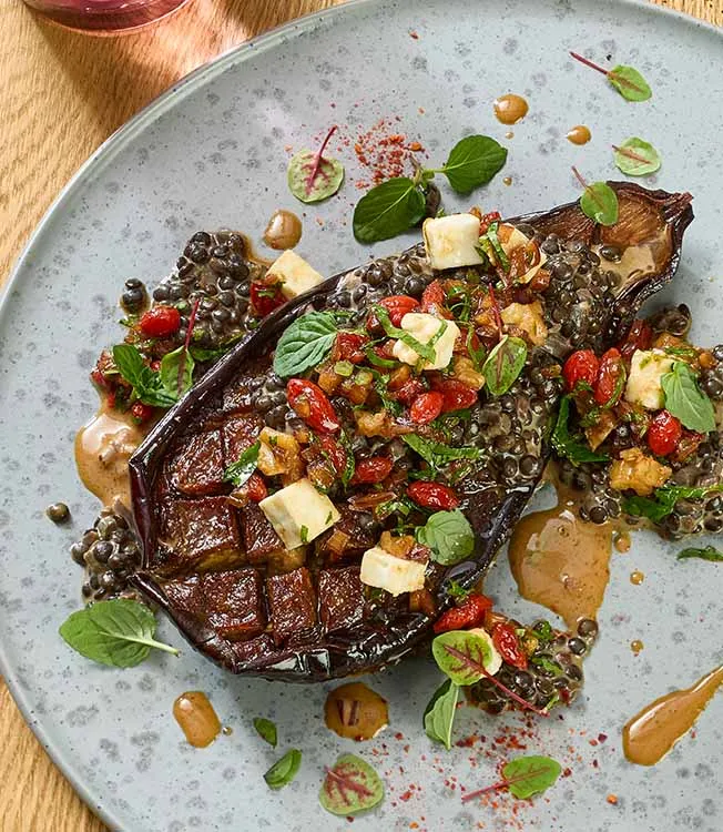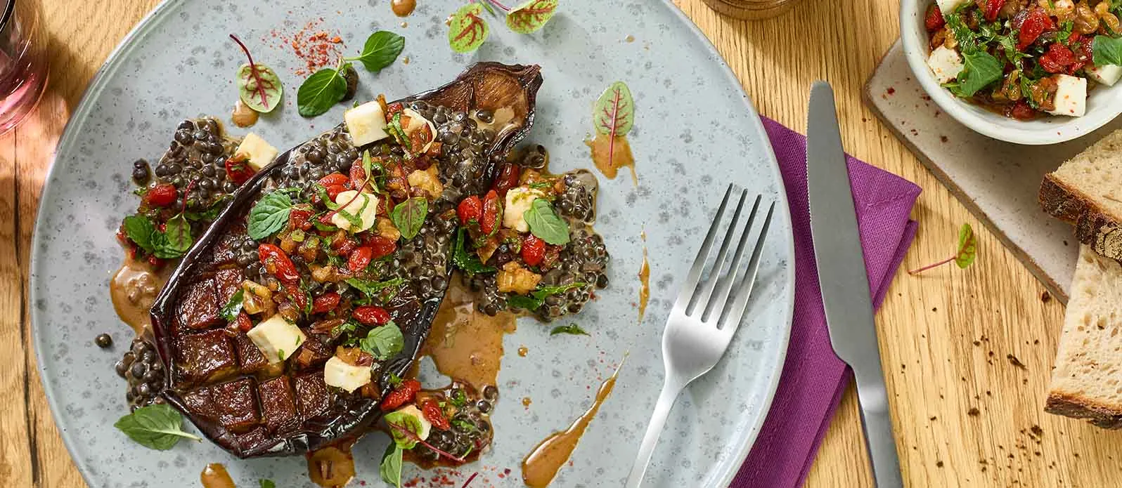Zur Vorbereitung können Sie die Auberginen auch schon mit den Linsen belegen und dann im Ofen oder Convectomaten regenerieren. So müssen nur noch Goji-Topping und Kresse frisch darübergegeben werden.