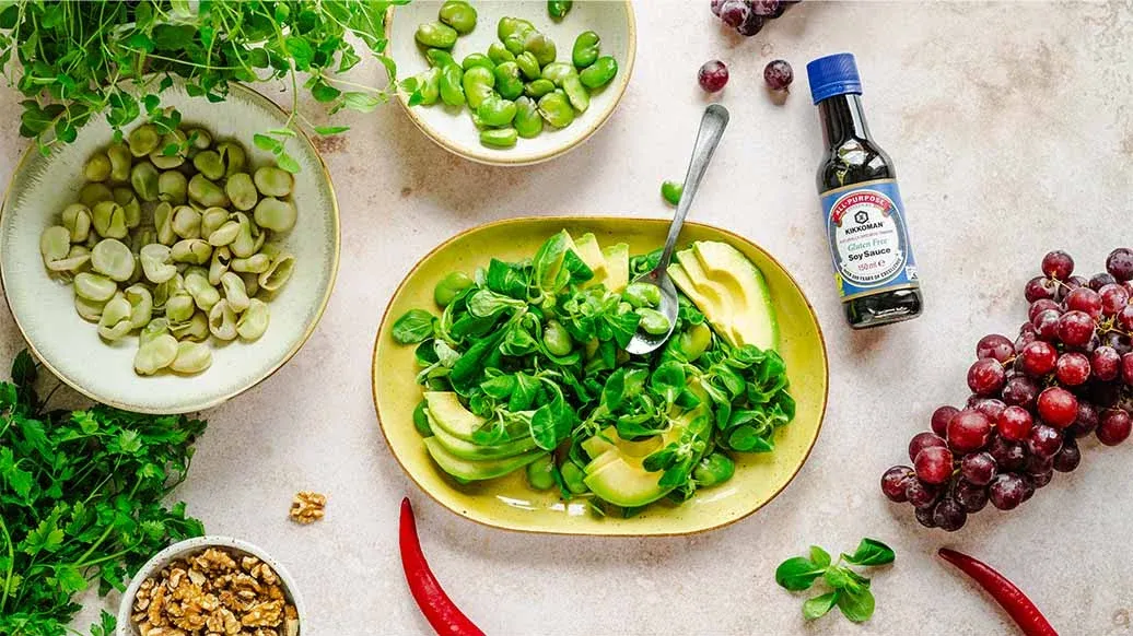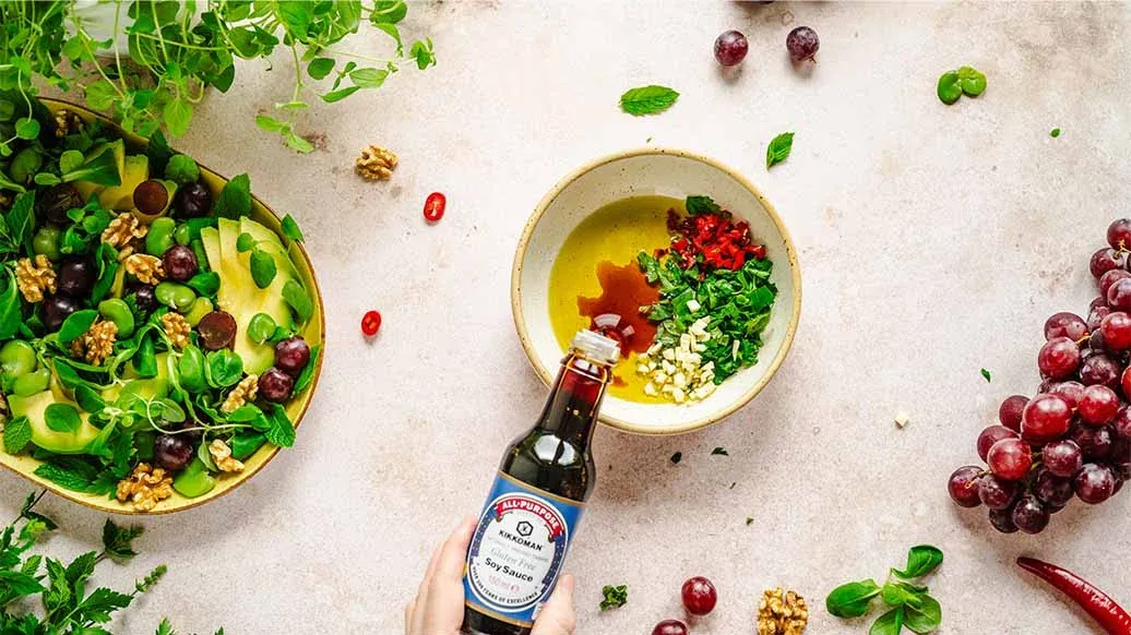 Knoblauch, Chilischote und Kräuter fein hacken. Mit Olivenöl, Kikkoman glutenfreie Sojasauce und Apfelessig vermischen. Die Chimichurri-Sauce über den Salat träufeln.
