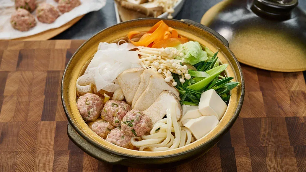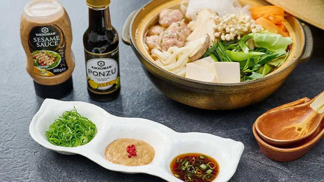 Diese herzhafte Bouillon, die einst in Sumo-Schulen zur Kräftigung serviert wurde, enthält reichlich Tofu-Fleischbällchen, frisches Gemüse und Nudeln. Sie wird mit Kikkoman Ramen Suppenbasis und Kikkoman Sesamöl gewürzt und mit Dips serviert.