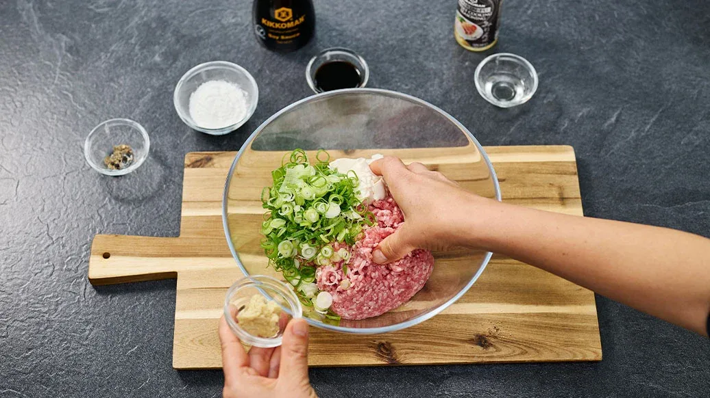 400 g Hackfleisch, beliebige Sorte – 100 g Tofu – 1 EL Kikkoman natürlich gebraute Sojasauce – 1 TL Kikkoman süsse Würzsauce zum Kochen nach Mirin-Art – 2 TL Ingwer, gerieben – 3 Frühlingszwiebeln, fein gehackt – 2 EL Maisstärke – Eine Prise schwarzer Pfeffer