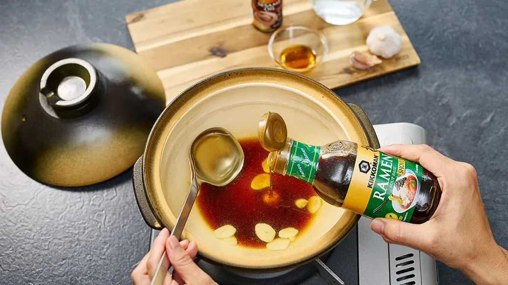 Wasser, Kikkoman Ramen Suppenbasis, Kikkoman Sesamöl und Knoblauch in einen Topf geben.