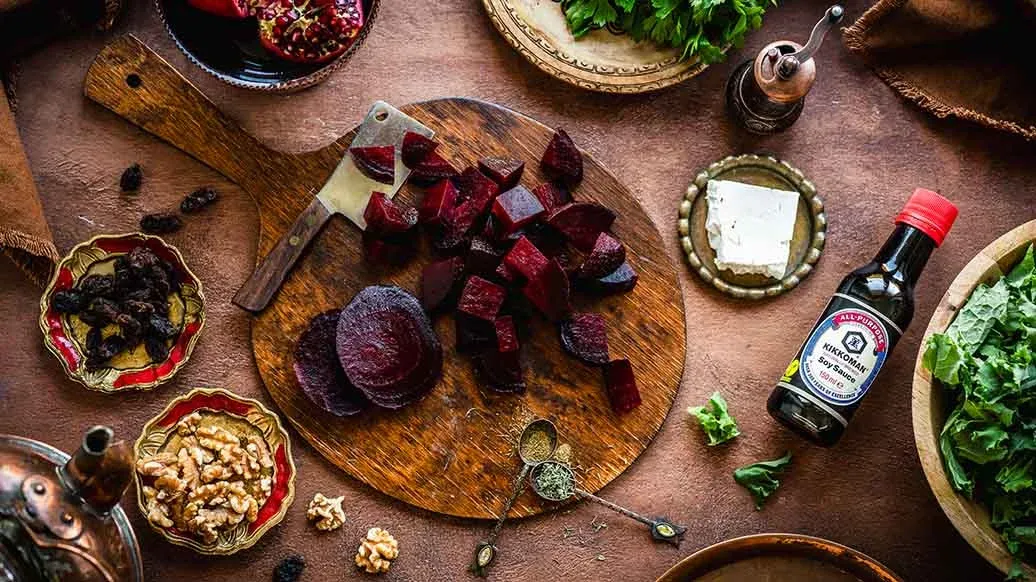 Dieser farbenfrohe Salat ist vom Nahen Osten inspiriert, mit gerösteten Randen, Federkohl, süssen Rosinen und Granatapfelkernen. Abgerundet mit Baumnüssen, Feta und einem Thymian-Soja-Dressing ein feines Gericht für jede Jahreszeit.