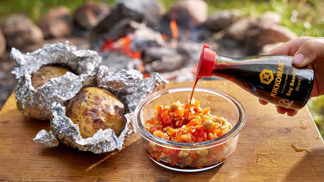 In der Glut gebackene Kartoffeln mit einem subtilen Raucharoma, garniert mit einer Salsa aus gerösteter Peperoni, Knoblauch und Kichererbsen und abgerundet mit Kikkoman Sojasauce – einfach köstlich!