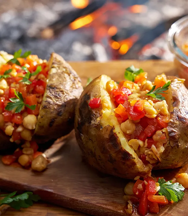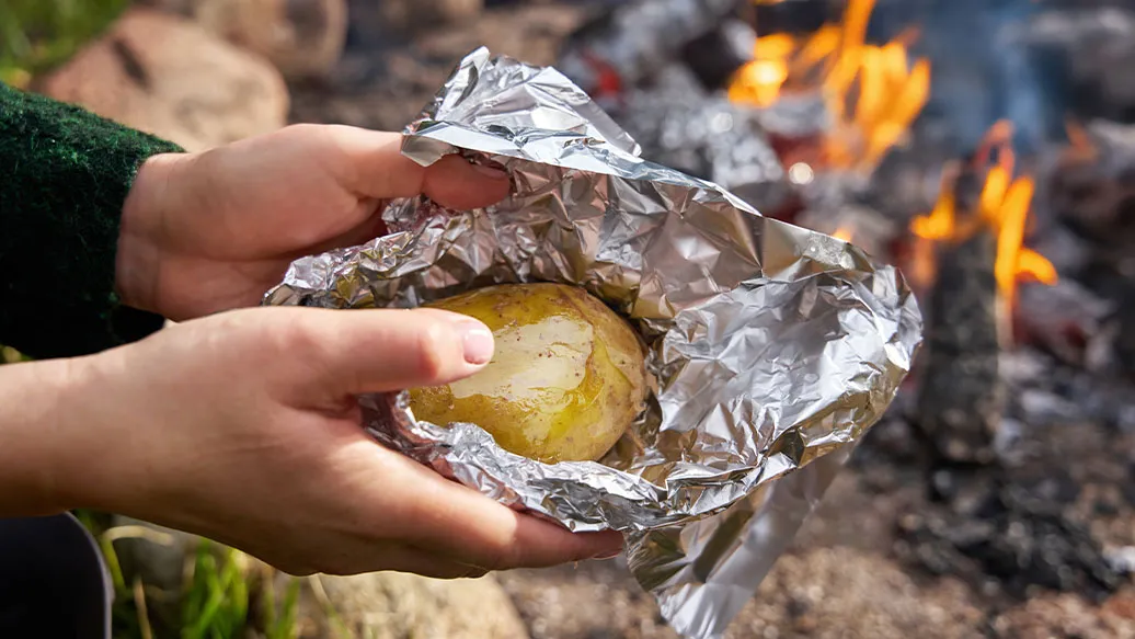 Kartoffeln mit Rapsöl beträufeln, in Alufolie wickeln und etwa 40 Minuten in der Glut des Lagerfeuers garen.