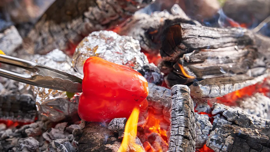 Peperoni über dem Feuer rösten. In eine Schüssel geben, fest abdecken und ca. 10 Minuten ruhen lassen. Dann die Haut abziehen.