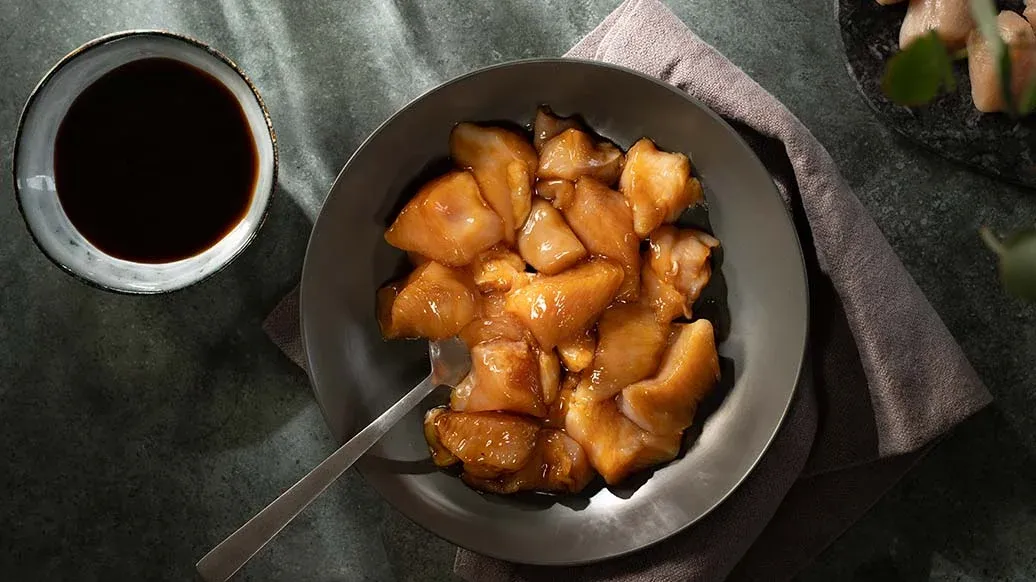 Pouletfleisch in 2 cm grosse Würfel schneiden. Mit Kikkoman Teriyaki BBQ Sauce Honig mindestens 1 Stunde marinieren.