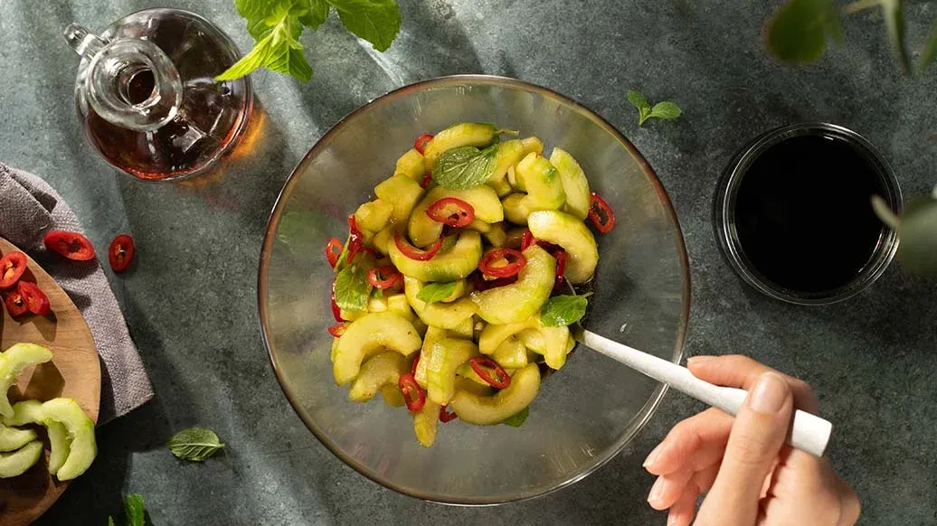 400 g Salatgurke, geschält – 1 rote Peperoni, in Ringen (alternativ: milde Chilischote) – 2 Stängel Minze, gezupft – 2 EL Kikkoman Würzmittel für Sushi-Reis (125ml) – 3 EL Kikkoman natürlich gebraute Sojasauce – 2 EL Kikkoman geröstetes Sesamöl