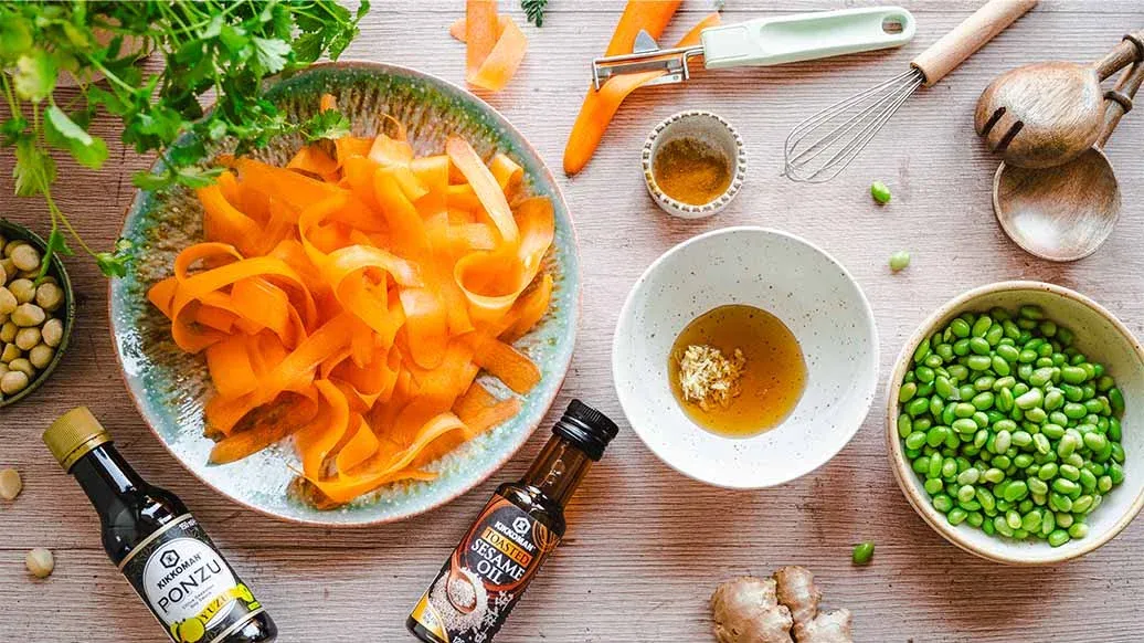Karotten schälen und in dünne Streifen schneiden. Mit Kikkoman Ponzu Yuzu, Kikkoman Sesamöl, Kurkuma und Ingwer vermischen. 10 Minuten marinieren.