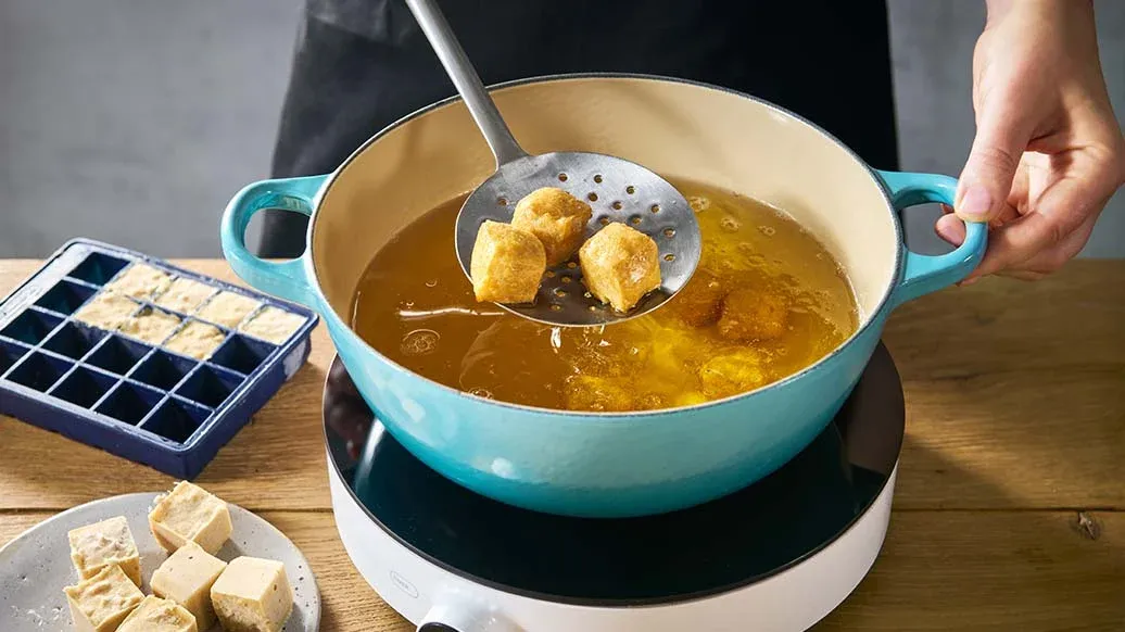 Die angefrorenen Takoyaki in heissem Öl frittieren, bis sie goldbraun sind.