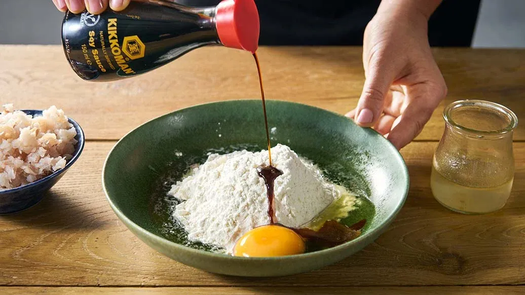100 g Weizenmehl – 30 g Speisestärke – ½ TL Backpulver – 40 ml Kikkoman natürlich gebraute Sojasauce – 1 Ei – 50 ml Dashi-Bouillon – 200 g weisses Fischfilet (z. B. Kabeljau, Seebrasse, Wolfsbarsch)