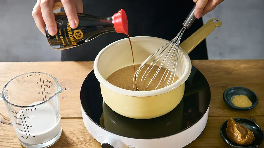 80 ml Kokosmilch – 70 g Erdnussbutter – 30 ml Kikkoman natürlich gebraute Sojasauce – 20 ml Reisessig – ½ TL Knoblauchgranulat