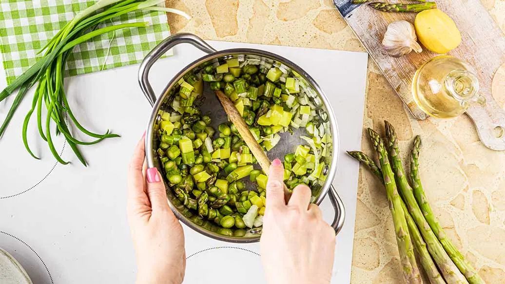 Den Spargel waschen und die holzigen Enden abschneiden. Die Spitzen von drei Stangen abschneiden und beiseite legen. Den restlichen Spargel in ca. 1 cm grosse Stücke schneiden. Kartoffeln schälen und fein würfeln. Zwiebel fein hacken und Knoblauch zerdrücken. Olivenöl und Butter in einem Topf mit schwerem Boden erhitzen. Zwiebel, Knoblauch, Kartoffeln und geschnittenen Spargel hinzufügen. 1 Minute lang anbraten.