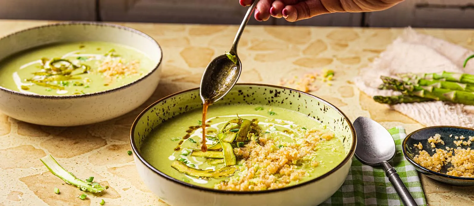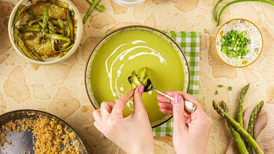 Knusprige Panko-Grünspargelcremesuppe