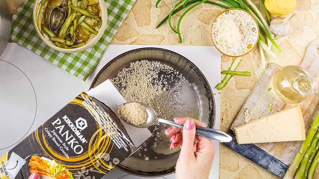 Olivenöl und Butter in einer Pfanne erhitzen. Kikkoman Panko hinzufügen und 2–3 Minuten goldbraun anbraten. In eine Schüssel geben, geriebenen Parmesan hinzufügen und gut vermischen.