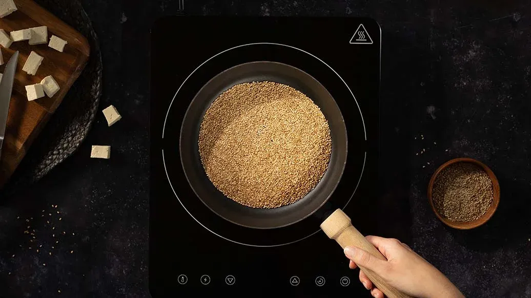 200 g schnittfester Tofu – 3 EL Sesam, geschält (= weisser Sesam)
