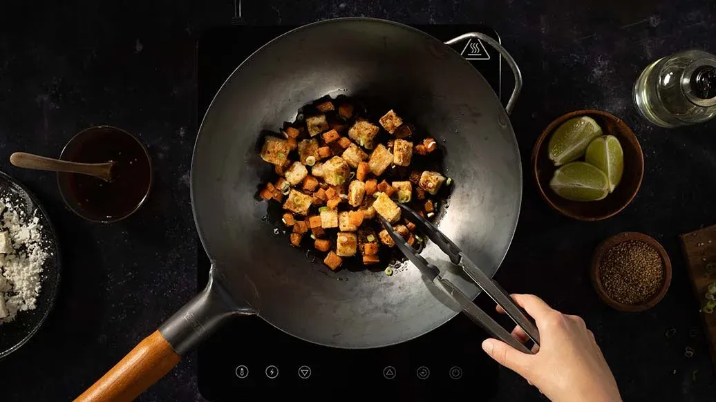 Tofu in Speisestärke wenden, überschüssige Stärke abschütteln. Süsskartoffelwürfel in eine Schüssel geben, den Wok mit Küchenpapier auswischen. Rapsöl erhitzen, den Tofu darin 5 Minuten goldbraun braten.
