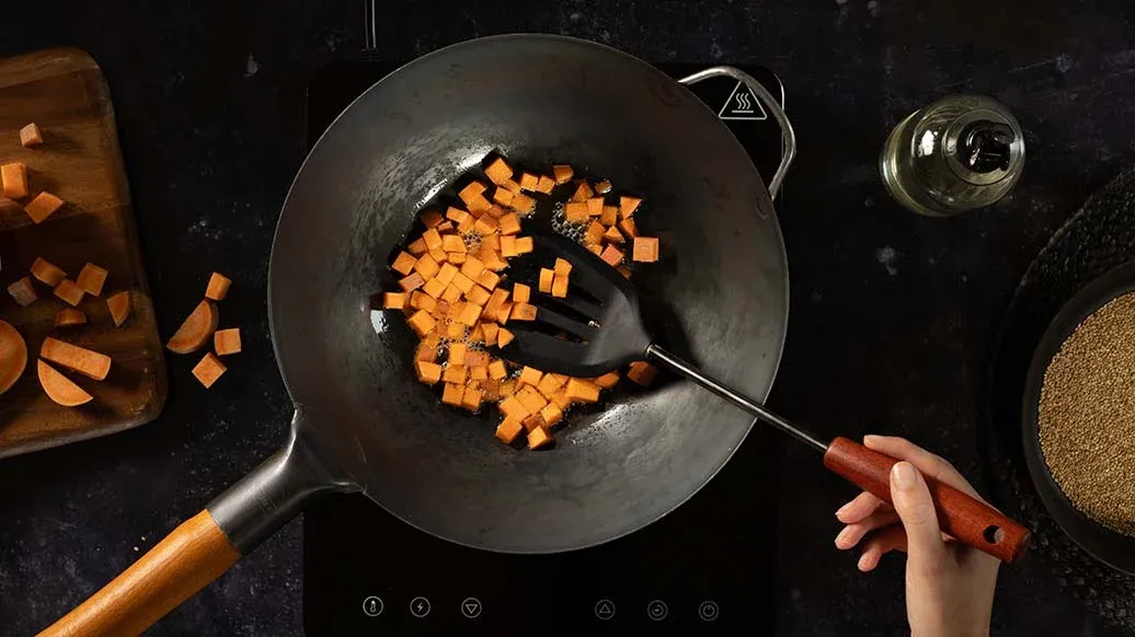 Süsskartoffeln gründlich waschen. In 1 cm grosse Würfel schneiden und mit dem Rapsöl in einem Wok mit Deckel bei mittlerer Hitze etwa 10 Minuten braten.