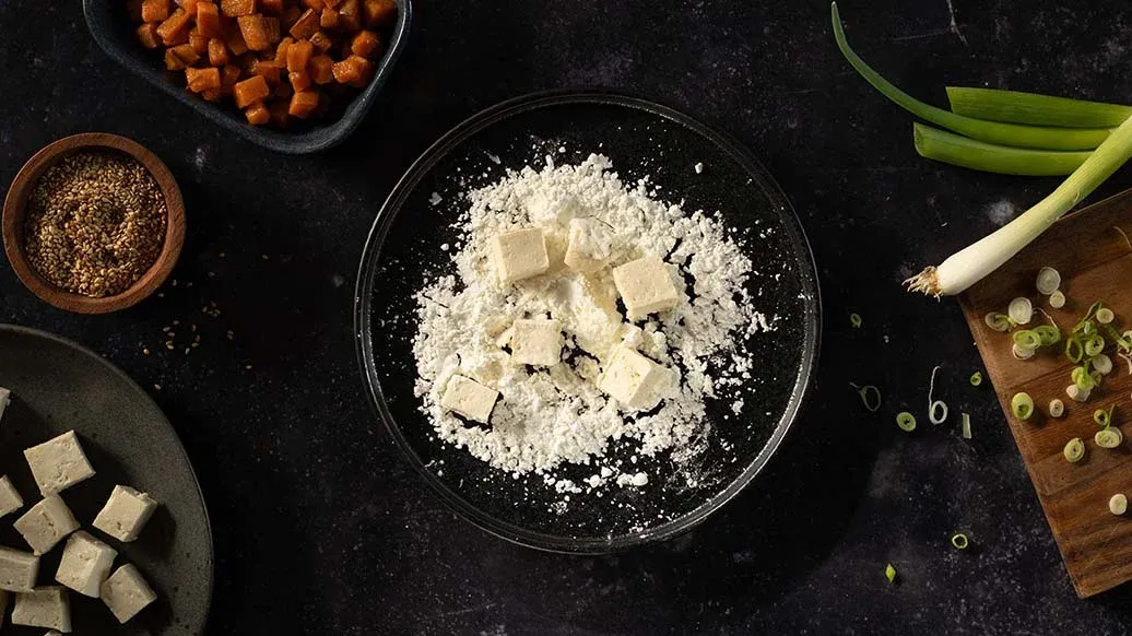 Ein japanischer Klassiker mit einem kleinen pflanzenbasierten Gemüse-Twist: Der knusprige Sesam-Tofu und cremige Süsskartoffeln ergeben ein wunderbares Zusammenspiel unterschiedlicher Texturen, sodass jeder Bissen sowohl crunchy als auch creamy ist.