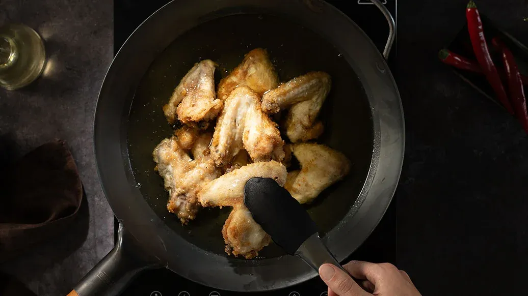 Öl in einem grossen Wok auf 175 °C erhitzen. Das Poulet darin ca. 10 Minuten frittieren, bis es hell goldbraun ist. Herausnehmen, abtropfen lassen und 10–15 Minuten ruhen lassen.