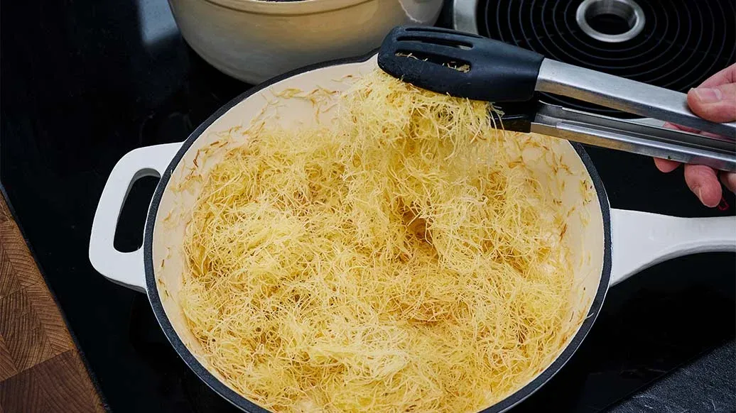 Eine Pfanne (22 cm Ø) oder 4-8 Portionsförmchen mit reichlich Butter einfetten. Die Hälfte der Kadayif-Butter-Mischung in die Pfanne geben und gleichmässig fest andrücken. Dil Peyniri darauf verteilen, dabei einen ca. 1 cm breiten Rand frei lassen. Die restliche Kadayif-Butter-Mischung darauf geben und gut andrücken, bis die Oberfläche fest ist und die Ränder „rund” sind. Die Pfanne bei niedriger bis mittlerer Temperatur erhitzen und Künefe 3-5 Min. braten, bis die Unterseite goldbraun ist. Wenden (z. B. mithilfe einer Tortenplatte oder eines grossen Tellers) und weitere 2-4 Min. braten.
