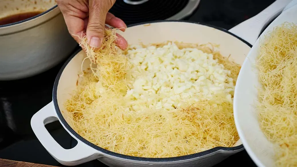 Butter schmelzen und mit Kadayif vermischen, sodass alles gut von der Butter überzogen ist.