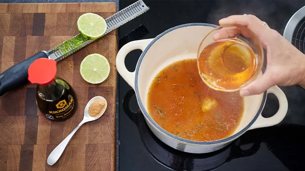 Etwas Limettenschale abreiben, Limette halbieren und Saft auspressen. Limettenabrieb und -saft mit Honig, Kikkoman Sojasauce, Zimt und 75 ml Wasser in einem kleinen Topf 3-5 Min. köcheln lassen. Optional: Rosenwasser zufügen.
