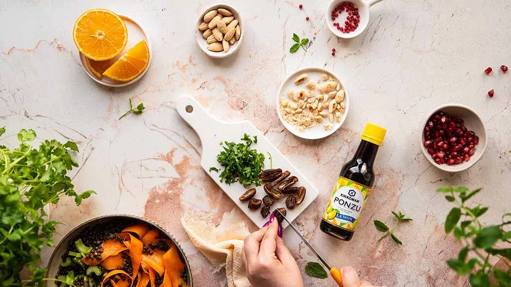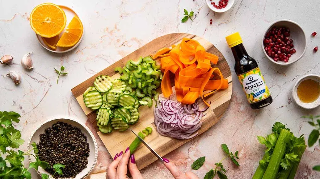 Karotte schälen und in Streifen schneiden. Gurke und Sellerie in Scheiben und Zwiebel in dünne Scheiben schneiden. Das Gemüse mit den Linsen vermengen. In einer separaten Schüssel Olivenöl mit Kikkoman Ponzu Zitrone, Orangensaft und -schale, Ahornsirup, Knoblauch, Zimt, Kreuzkümmel und rotem Pfeffer zu einem Dressing verrühren.