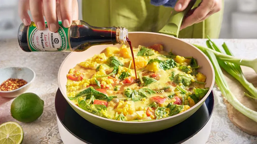 Kürbis schälen und in grosse Würfel schneiden. Linsen mit dem Kürbis und Kurkuma ca. 20 Minuten in Wasser kochen. In einer Pfanne Schalotte und Peperoni 2–3 Minuten in Kokosöl anbraten, dann Knoblauch und Ingwer hinzufügen und 30 Sekunden mitbraten. Die Linsen mit dem Kürbis unterrühren, Kokosmilch hinzufügen und 5 Minuten köcheln lassen. Mango und Spinat hinzufügen und 1–2 Minuten kochen lassen. Mit Limettensaft und Kikkoman salzreduzierter Sojasauce abschmecken.