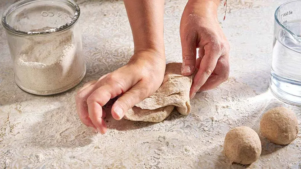 150 ml Weizenvollkornmehl – 20 g zusätzliches Mehl zum Bestäuben – 100 ml warmes Wasser – 20 g Ghee (Butterschmalz), geschmolzen