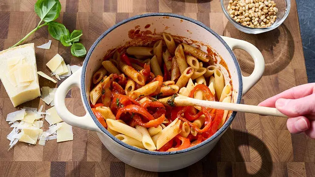 Pasta nach Packungsanweisung zubereiten und beim Abgiessen etwas Nudelwasser auffangen. Basilikum hacken und die Hälfte mit der Sauce vermischen. Die Sauce mit Kikkoman Sojasauce abschmecken. Die Pasta mit der Sauce, den Ofenpeperoni und dem aufgefangenen Nudelwasser vermischen und auf Tellern anrichten. Mit den Ofentomaten, dem übrigen Basilikum und den Pinienkernen garnieren, den Parmesan frisch darüber hobeln und servieren.