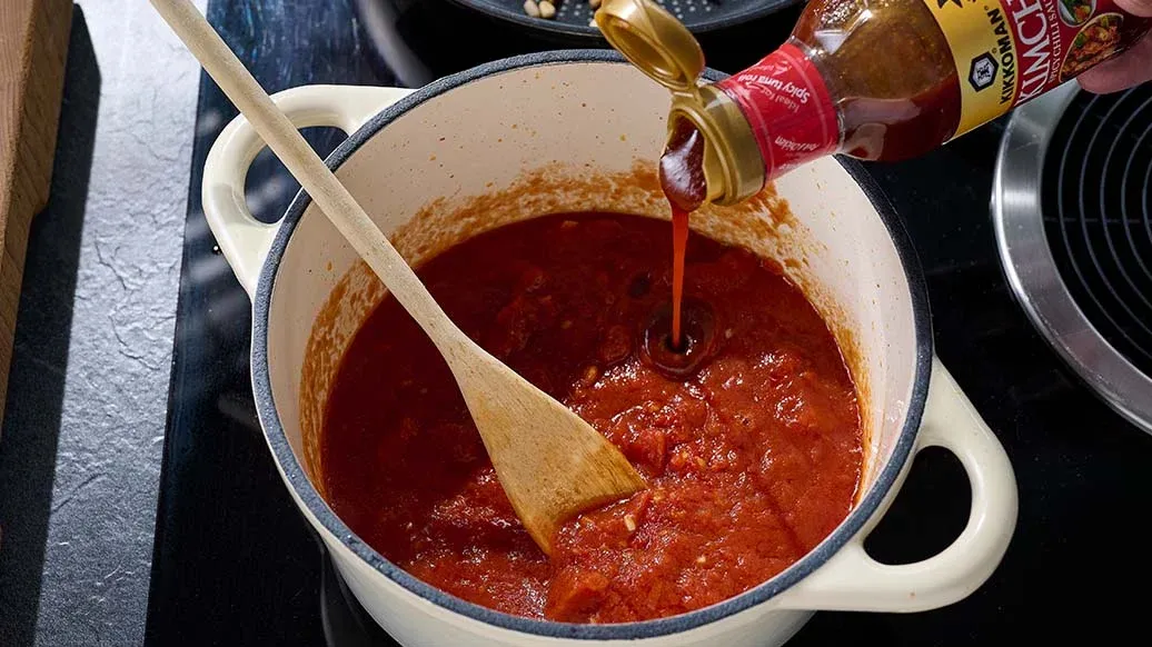 Italien trifft Japan: eine würzig-scharfe Sauce aus sonnengereiften Tomaten, verfeinert mit Kikkoman Sojasauce und Kikkoman Kimchi Chilisauce. Dazu gibt’s Pasta „al dente“, getoppt mit würzigem Käse und gerösteten Pinienkernen.