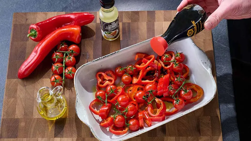 Den Backofen auf 200 °C vorheizen. Peperoni in Ringe schneiden, mit Tomaten, Öl, Zucker und Kikkoman Sojasauce vermischen, in einer kleinen Auflaufform verteilen und im Backofen 10 bis 15 Minuten garen (die Tomaten dürfen dabei ruhig aufplatzen).