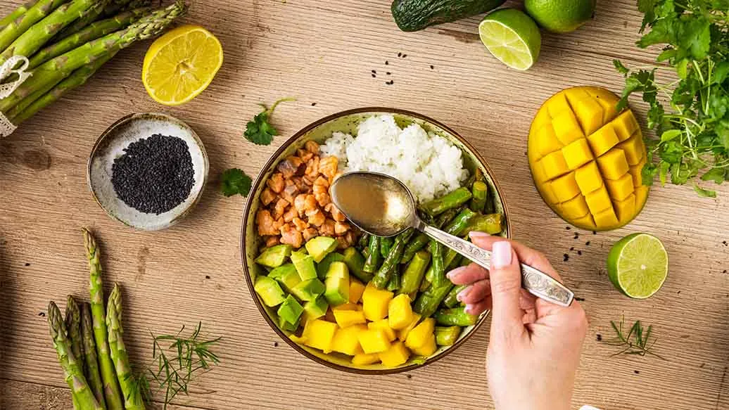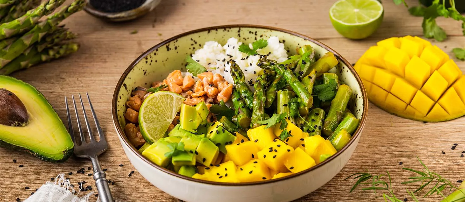 Poke Bowl mit Spargel und Lachs-Ceviche