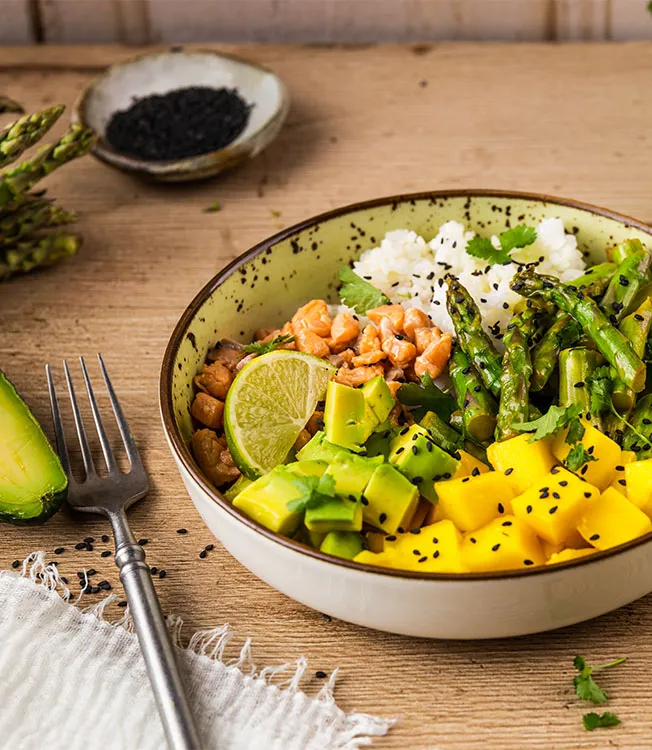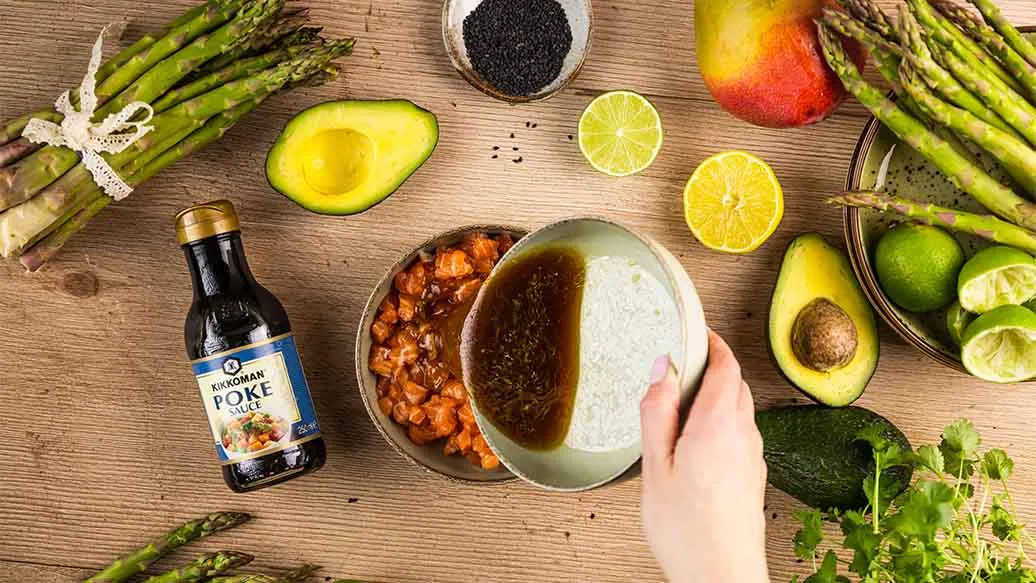 Eine leichte, frische Poke Bowl, inspiriert von der hawaiianischen Küche. In Limettensaft und Kikkoman Poke Sauce marinierte Lachs-Ceviche, serviert mit knackigem grünem Spargel und aromatischem Sushi-Reis. Mango und Avocado sorgen für Ausgewogenheit und Farbe.