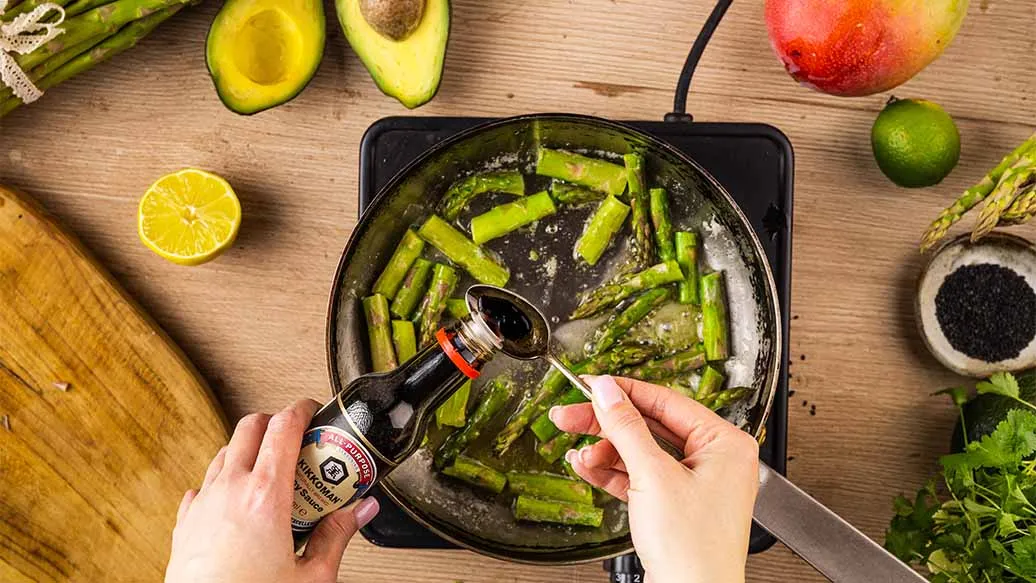 Spargel waschen, holzige Enden abschneiden und in 3–4 cm grosse Stücke schneiden. Butter und Olivenöl in einer Pfanne erhitzen, Spargel hinzufügen und unter häufigem Rühren 2–3 Minuten anbraten. Zitronensaft und Kikkoman Sojasauce hinzufügen, vermischen und noch 1 Minute weitergaren. Beiseitestellen.