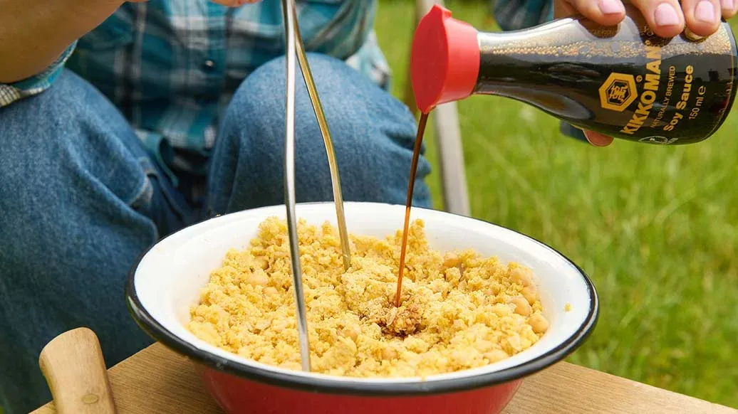 Die Zwiebel hacken. Zusammen mit den Kichererbsen in einen Mixer geben (alternativ mit einem Fleischwolf zerkleinern oder mit einem Kartoffelstampfer zerstampfen). Gewürze, Kikkoman Sojasauce, Natron und die Kräuter zu den Kichererbsen geben und alles vermengen. Aus der Masse Patties formen.