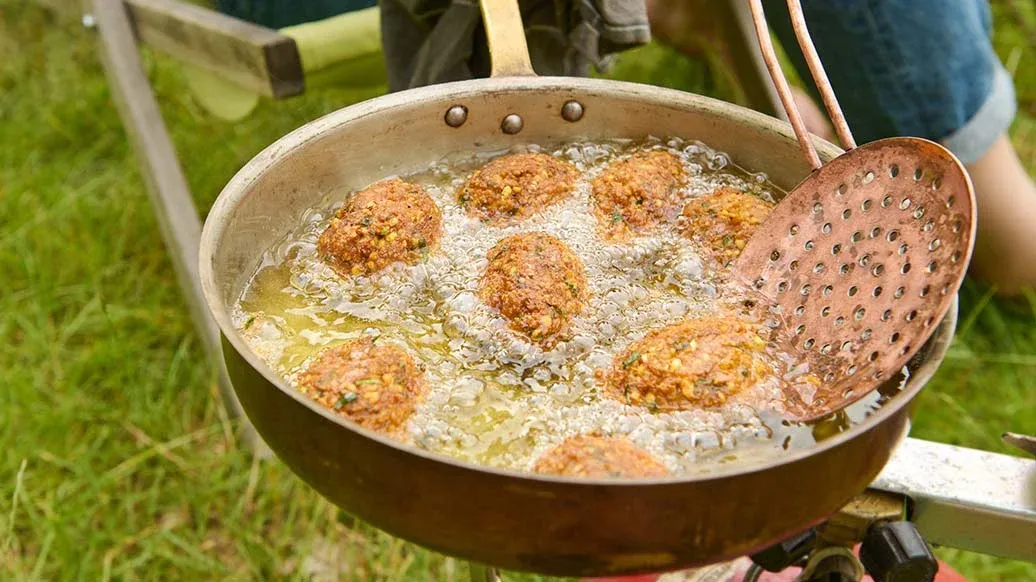 200 g Kichererbsen (eingeweicht) – 1 kleine Zwiebel – 1 EL Koriander, gehackt – 1 EL Petersilie, gehackt – ¾ TL Kreuzkümmel – ½ TL Koriander, gemahlen – ½ TL Chili – 1 TL Knoblauch, granuliert – 3 EL Kikkoman natürlich gebraute Sojasauce – 1 TL Natron