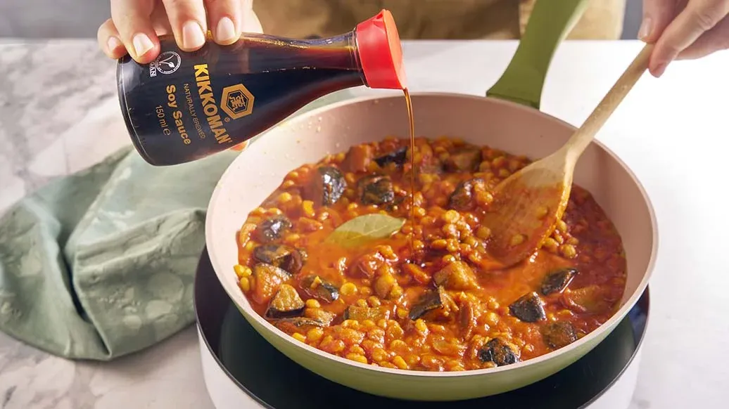 Kichererbsen-Dal mit Auberginen und geröstetem Knoblauch, verfeinert mit erdig-rauchigen Gewürzen und Kikkoman Sojasauce, serviert mit frischem Knoblauch-Naan und Koriander.