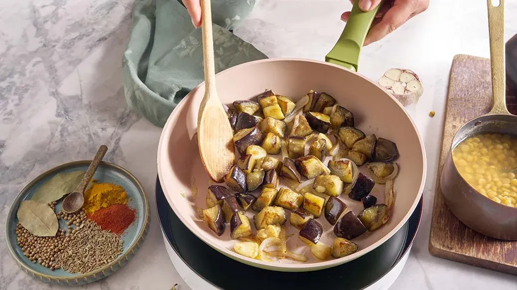 Oberseite der Knoblauchknolle abschneiden, damit die Zehen freiliegen. Mit Öl bestreichen und etwa 30 Minuten bei 180 °C im Ofen backen. Chana Dal 40 Minuten in Gemüsebouillon kochen. Zwiebeln und Auberginen in einer Pfanne 5 Minuten in Ghee anbraten, bis sie goldbraun sind, dann den gerösteten Knoblauch hinzufügen. Kreuzkümmel, Kurkuma, Koriandersamen, Paprikapulver und Lorbeerblatt zugeben und 10–15 Sekunden anbraten, damit sich die Aromen entfalten können.