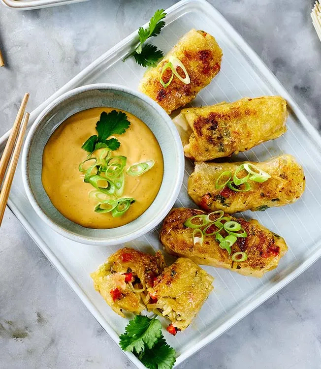Köstlich, knusprig und besonders schnell zubereitet – diese Reispapier-Teigtaschen mit vegetarischer Füllung und einer raffinierten Umami-Note haben das Zeug zum Lieblingsgericht. Dazu gibt’s einen feinen, cremig-scharfen Chili-Dip.