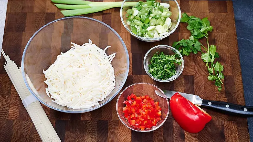 Nudeln nach Packungsanweisung zubereiten und in kleine Stücke schneiden. Frühlingszwiebeln in Ringe und Peperoni in kleine Würfel schneiden, Koriander fein hacken.