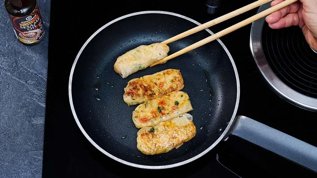 Kikkoman Sesamöl in einer grossen Pfanne erhitzen und die Teigtaschen von allen Seiten 4–6 Minuten goldbraun braten.