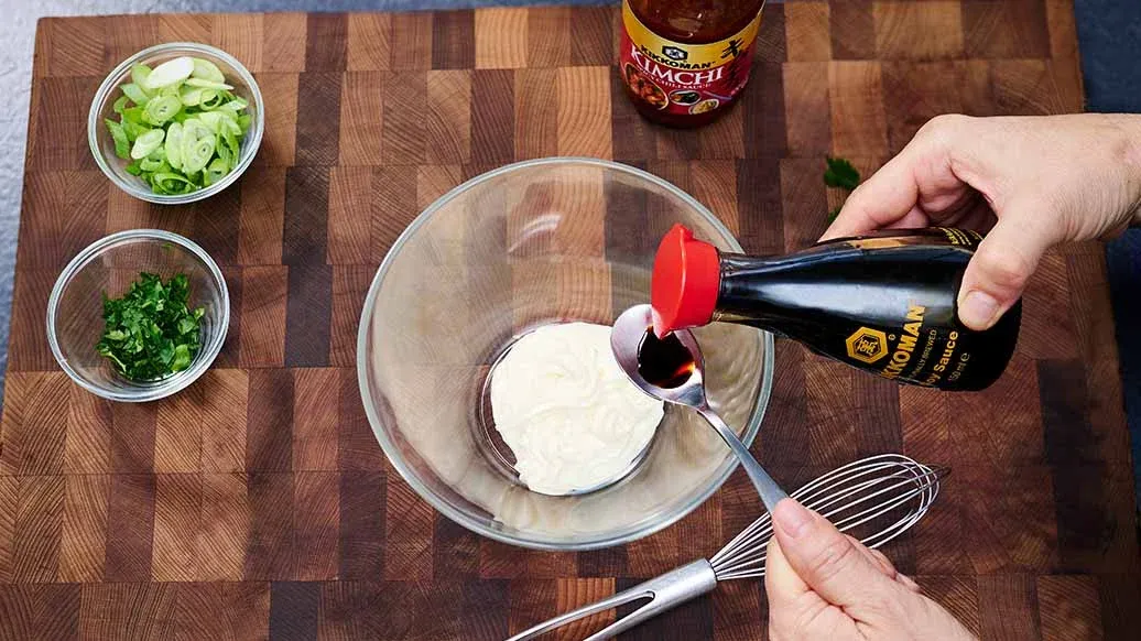 4 ½ EL Mayonnaise – 1 TL Kikkoman scharfe Chilisauce für Kimchi – 2 TL Kikkoman natürlich gebraute Sojasauce – 1 Stängel Koriander für die Garnitur (alternativ: glatte Petersilie) – 1 Frühlingszwiebel
