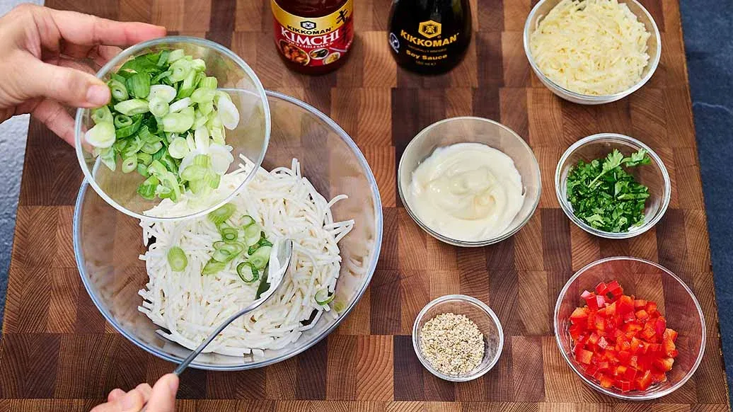 Die Nudeln, ⅔ der Frühlingszwiebeln, den Koriander, die Peperoni, Sesam, Kikkoman Kimchi Chilisauce, Mayonnaise, Käse und Kikkoman Sojasauce vermischen.