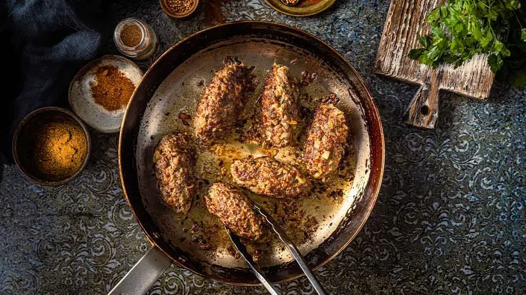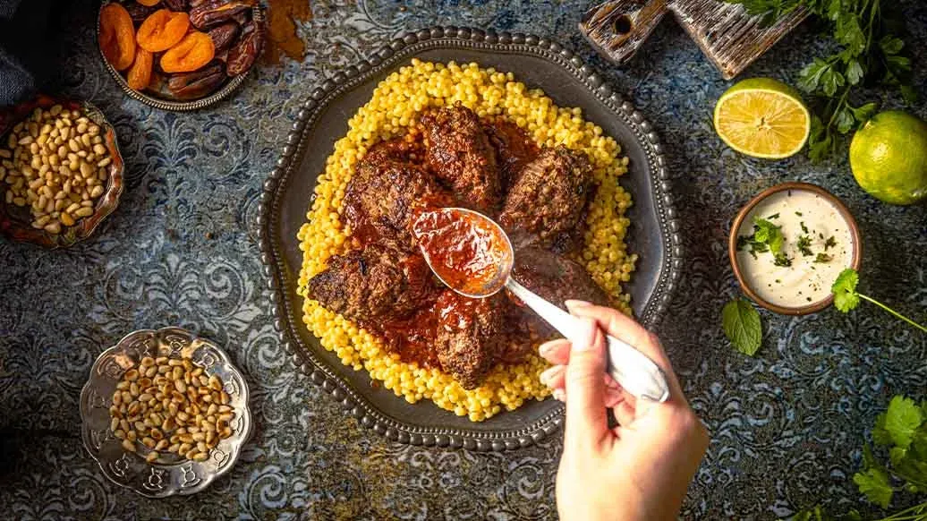 Kräftige Rindfleisch-Kofta, gewürzt mit Zimt, Kreuzkümmel und frischen Kräutern, geschmort in einer würzigen Tomatensauce mit Limette. Serviert mit Couscous, Joghurt und Pinienkernen – ein wärmendes Gericht voller orientalischer Aromen.