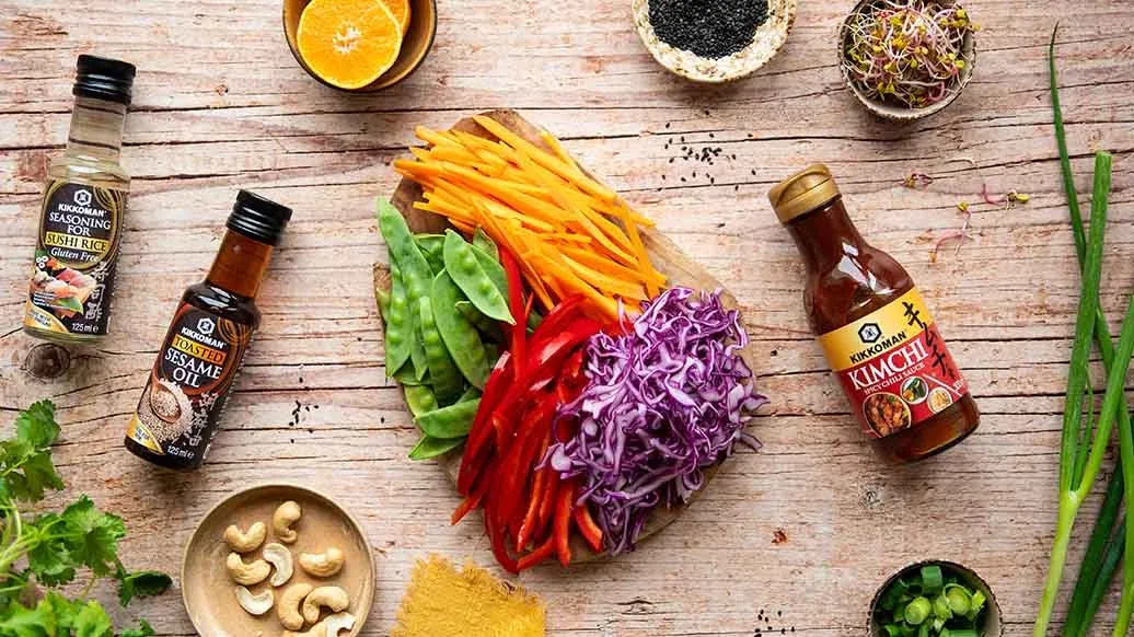 Dieser Rotkabissalat mit Gemüse ist kräftig im Geschmack und farbenfroh auf dem Teller. Er wird mit cremigem Dressing aus Kikkoman Kimchi Chilisauce und Kikkoman Sesamöl angemacht und mit Cashewkernen, schwarzem Sesam und frischem Koriander garniert.