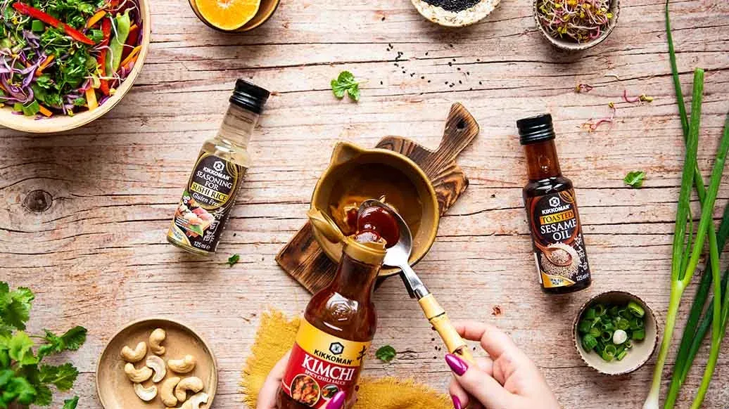 1 EL Kikkoman scharfe Chilisauce für Kimchi – 1 EL Mandarinensaft, frisch gepresst – 1 EL Erdnussbutter – 1 EL Kikkoman geröstetes Sesamöl – 1 TL Ahornsirup – 1 TL Kikkoman Würzmittel für Sushi-Reis (125ml) – ½ EL Wasser – 20 g Cashewkerne – 2 TL schwarzer Sesam