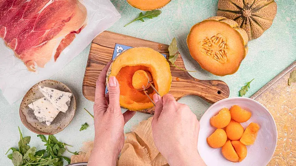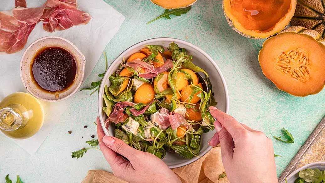 Dieser Sommersalat kombiniert süsse Melone mit cremigem Gorgonzola, kräftigem Prosciutto und pfeffriger Rucola. Ein Honig-Dressing und Kikkoman salzreduzierter Sojasauce sorgen für viel Umami – perfekt als leichter Lunch oder schicke Vorspeise.