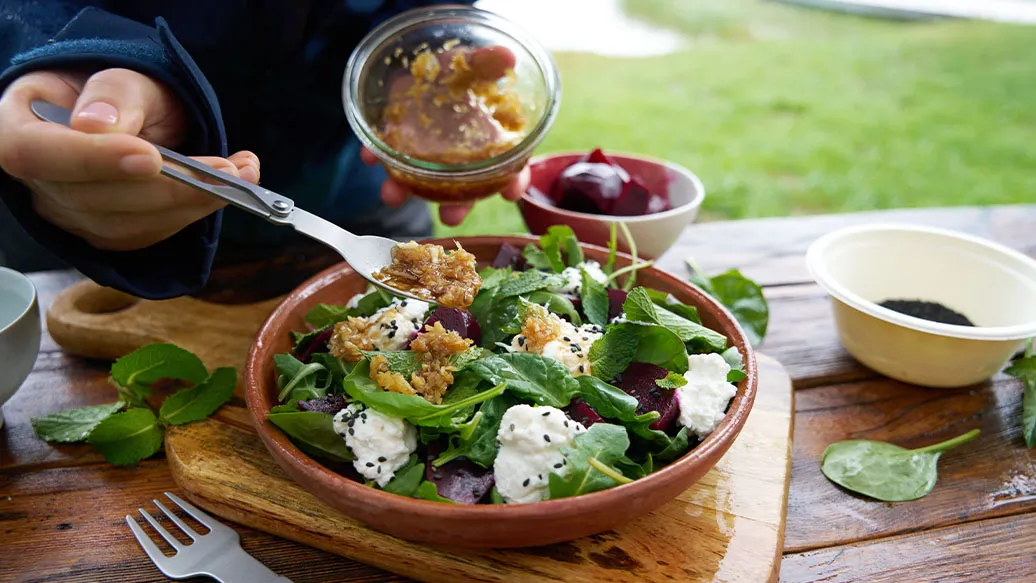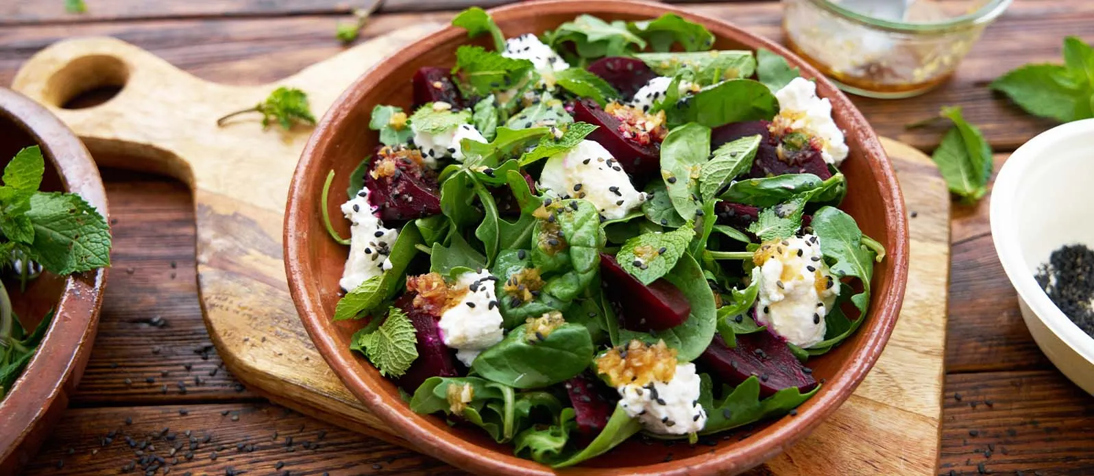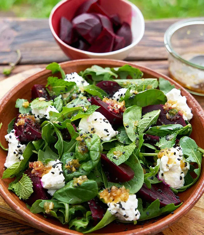 Die Randen in Spalten schneiden und auf einem Teller anrichten. Ricotta in kleine Stücke zerteilen und daraufgeben, dann Rucola und Spinat darauf verteilen. Mit dem Dressing beträufeln, mit Minzblättchern garnieren und mit Sesam bestreuen.